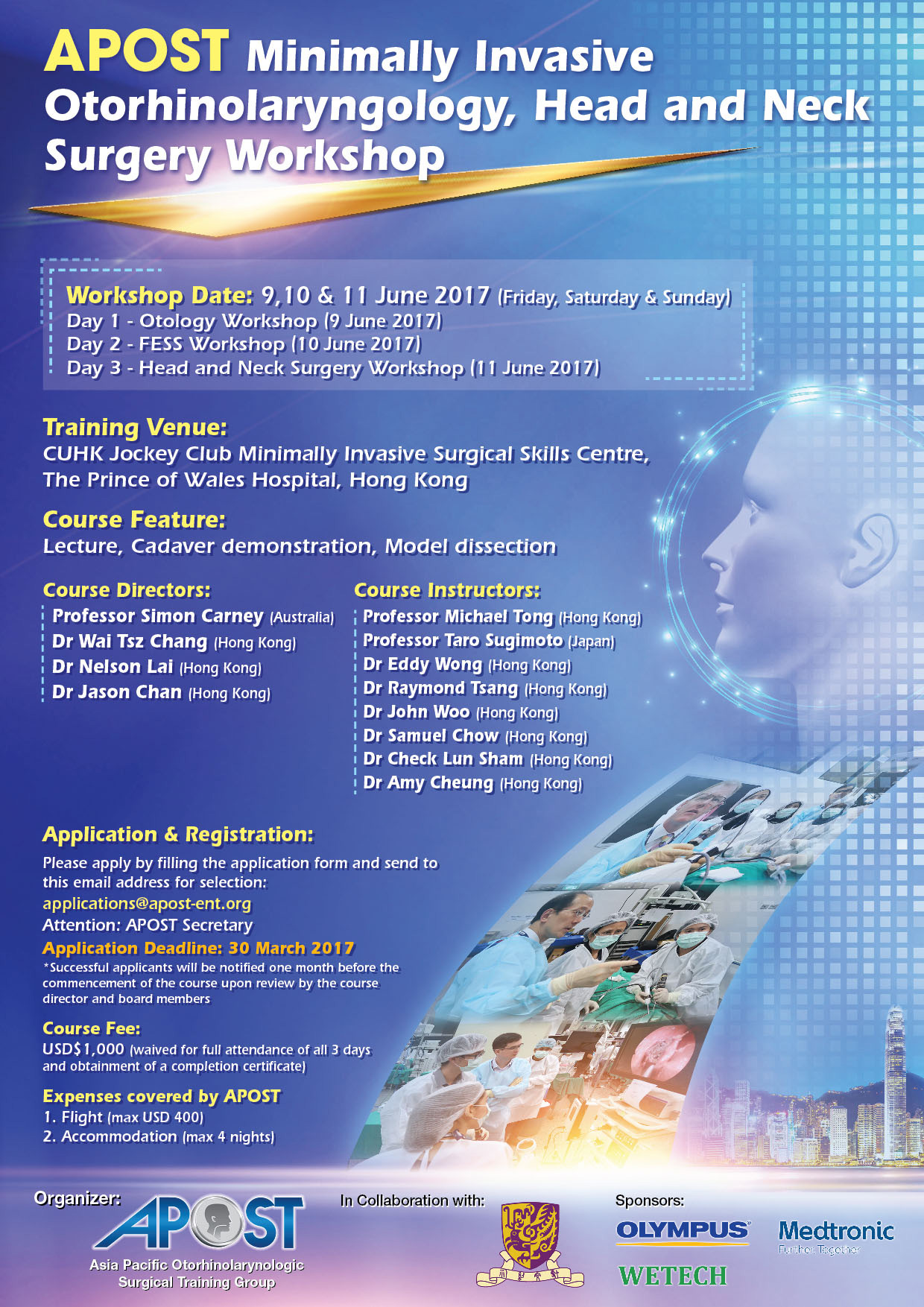 With recent advances in endoscopic treatment of disorders of the sinuses, ear and H& N disease, it is imperative that otolaryngologists are up to date on the latest surgical techniques. The training course provides a training platform to FESS procedure. The first day of this course will focus on treatment of endoscopic surgery of Ear. The second day will highlight rhinologic topics, including surgery of the turbinate, frontal sinus and orbit. Training faculties will have hands-on cadaveric dissection supervised. The third day will be dedicated to cutting-edge technologies for Head & Neck Surgery on cadaveric dissection demonstration.